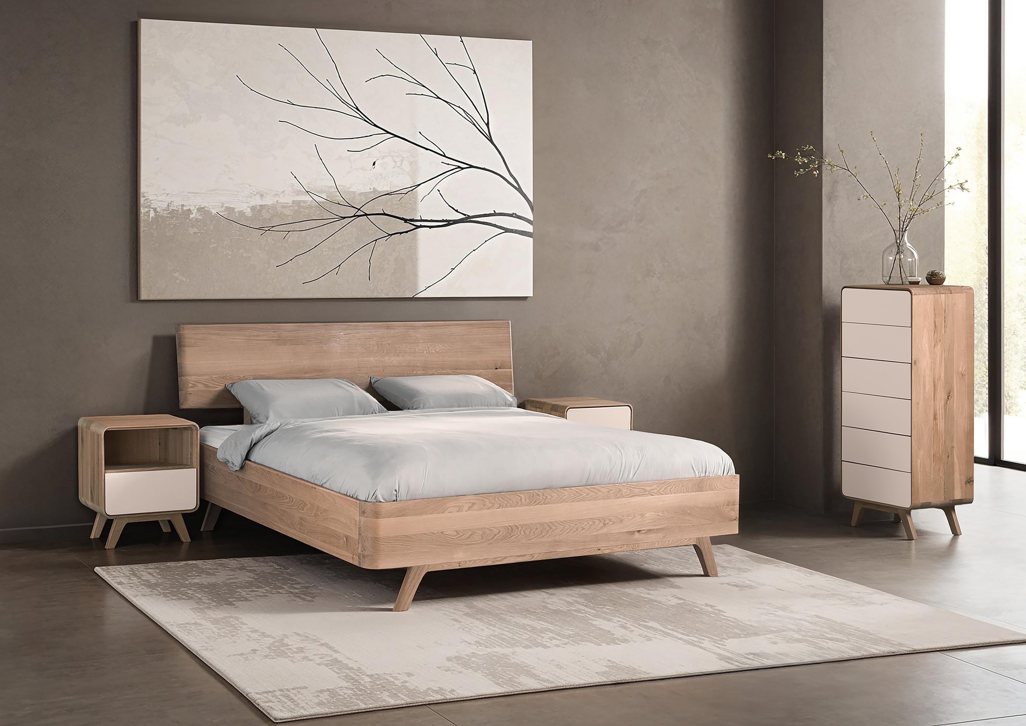 Het Avolo ledikant van Van Os heeft een prachtige natuurlijke uitstraling. Het is gemaakt van gelaagd massief eiken. De Lade frontjes zijn standaard gelakt in de kleur RAL 1013 maar je kunt ze in iedere gewenste RAL kleur laten spuiten.