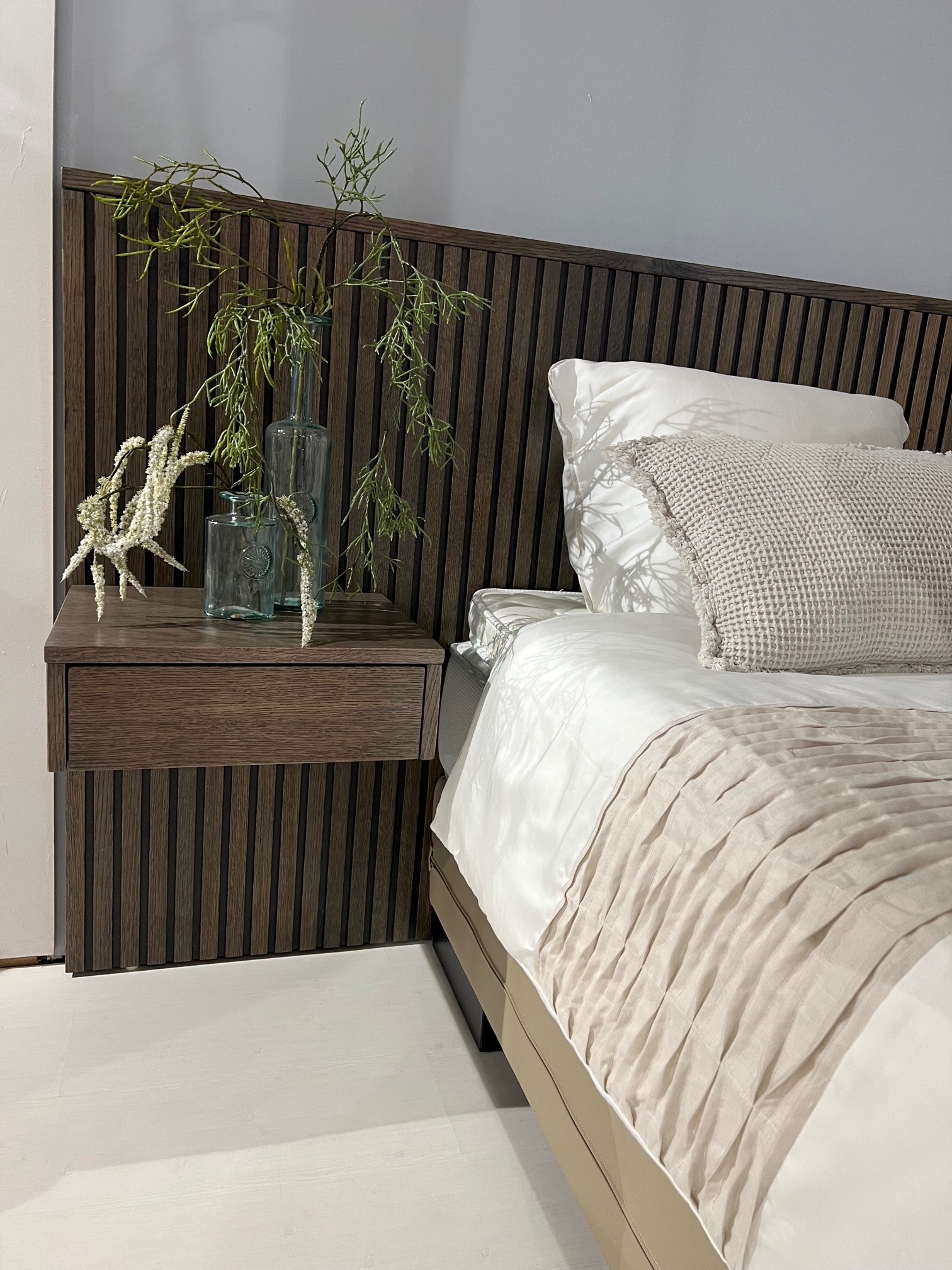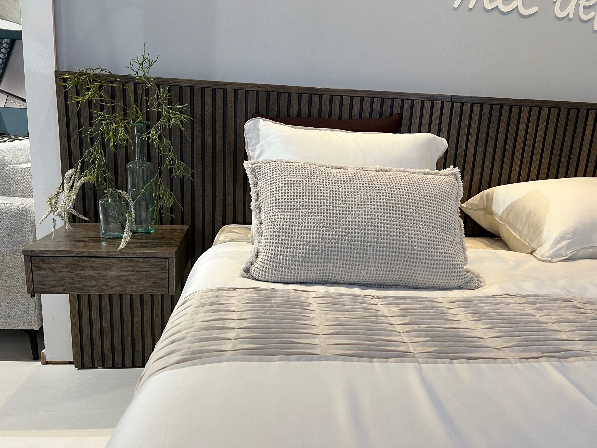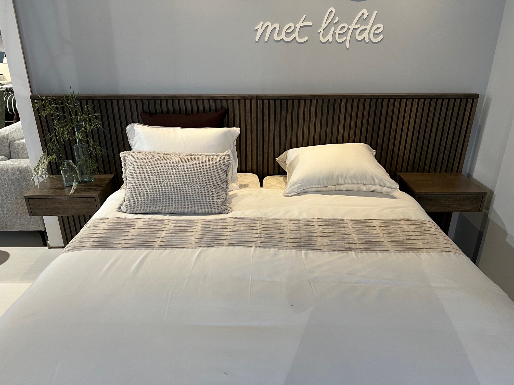 Het hoofdbord kan op uw gewenste hoogte gemaakt worden tot maximaal 117 cm. Je kunt kiezen uit eiken natural, eiken white wash en eiken mice grey (zoals op de foto). Het hoofdbord heeft standaard een uitstek van 55 cm aan beide zijdes, maar dit kan ook worden aangepast.