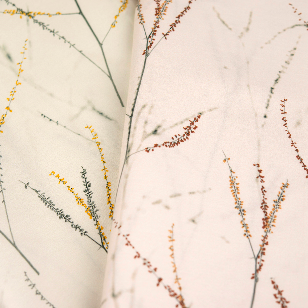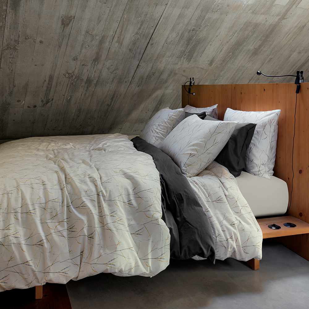 Het dekbedovertrek heeft een prachtige uitstraling door het rustige dessin. Een rustige print van takjes. Het dekbedovertrek is leverbaar in 2 kleuren, geel en terracotta.