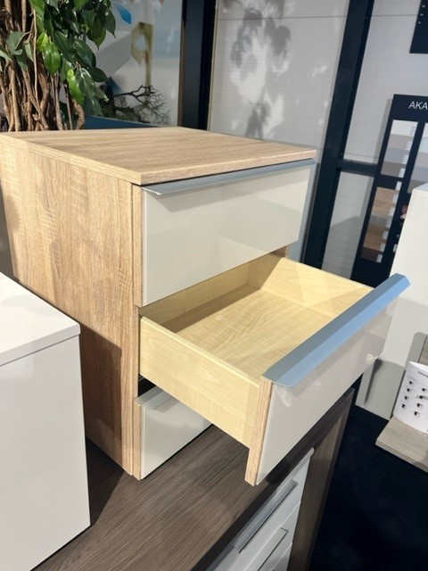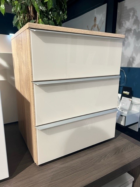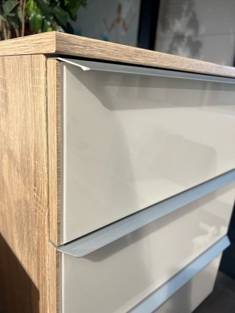 2 Nolte nachtkastjes Akaro, romp Sonoma eiken imitatie. Frontjes van de lades zijn bekleed met wit glas. Brede aluminium greep.