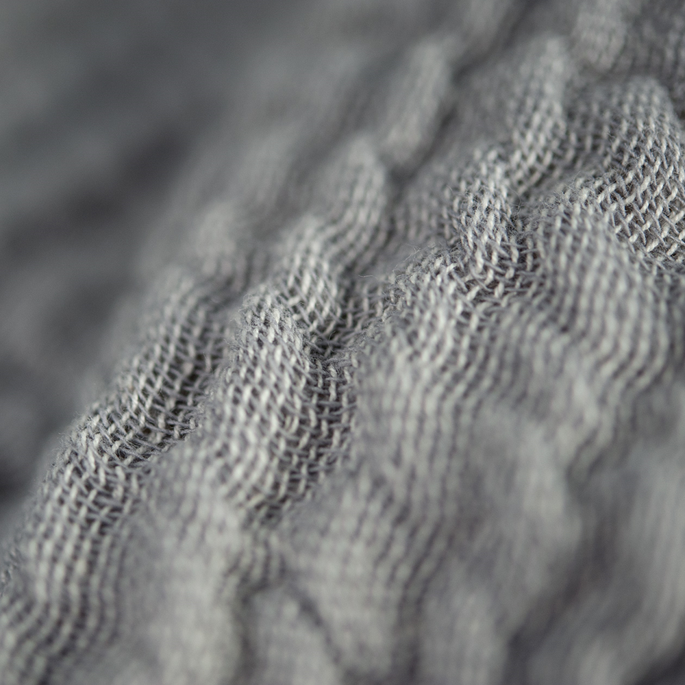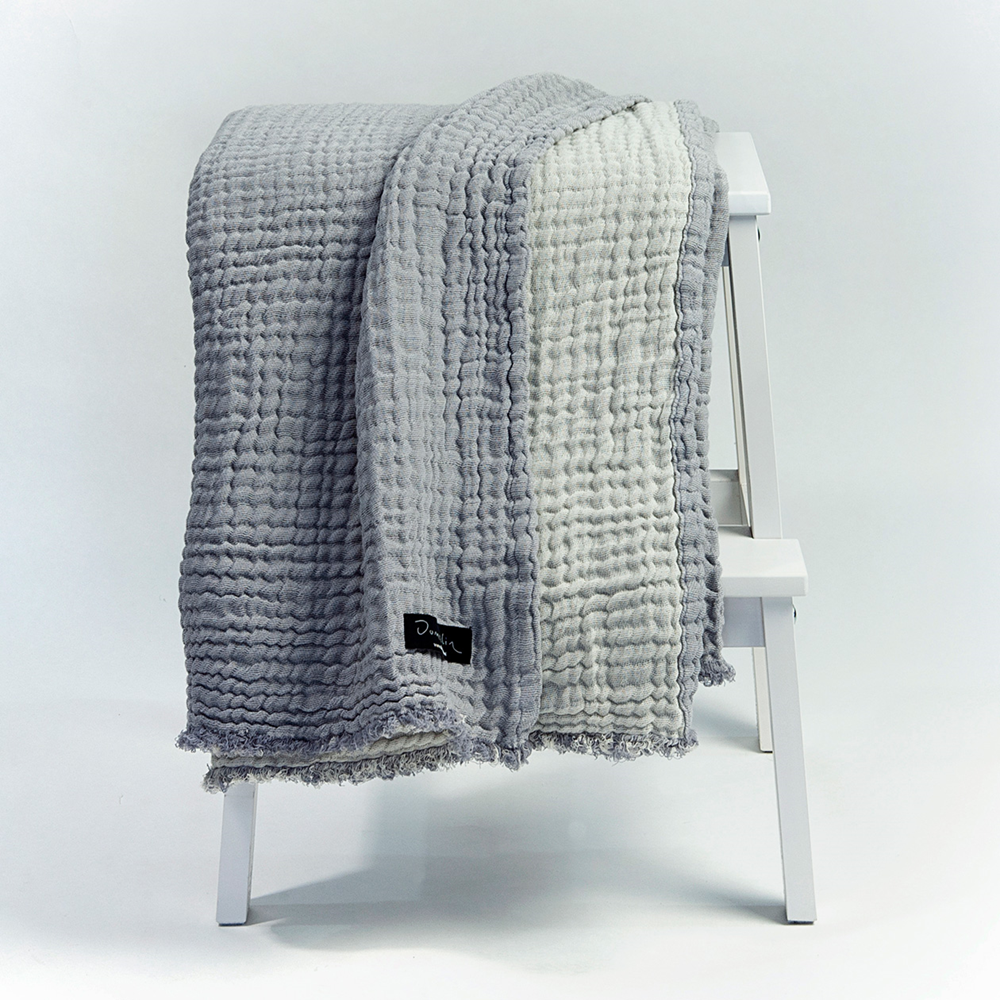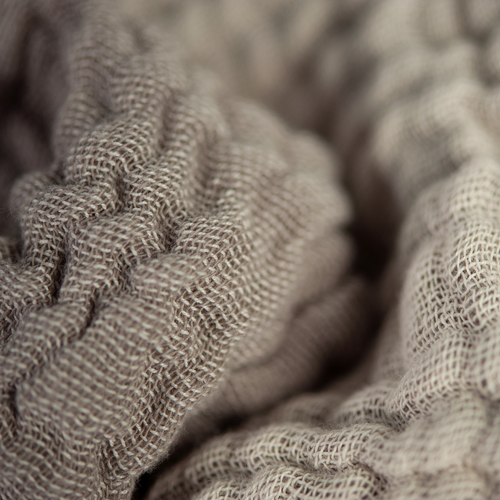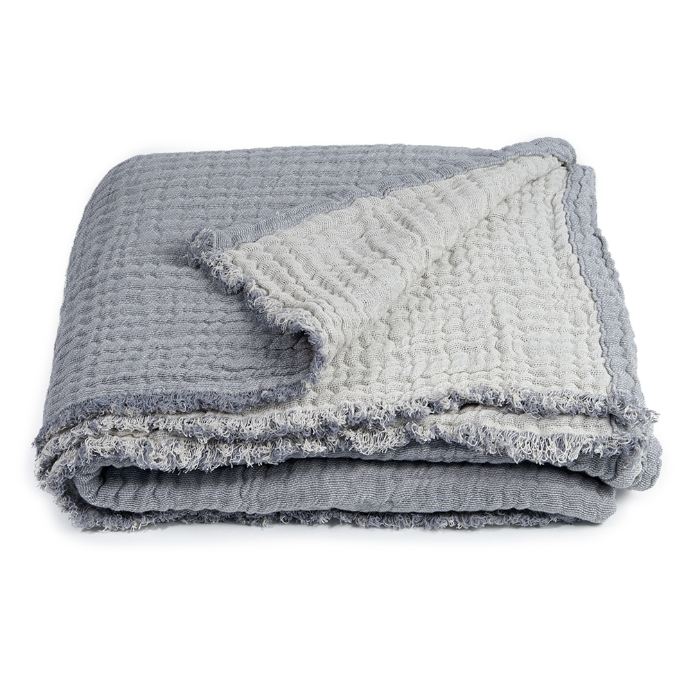 Mooie plaid voor over het bed of op de bank. Het is gemaakt van 100% katoen. Hij is leverbaar in 2 kleuren, grijs en taupe. De maat is 130x180 cm.